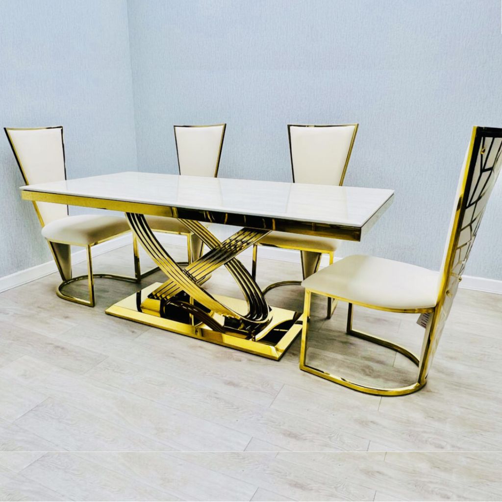Elevate your dining space with the Elina Cream and Gold Marble Dining Table, a stunning blend of classic elegance and modern luxury. Measuring 180cm in length, this grand rectangular table features a high-gloss cream marble-effect top with gold veining, paired with a glamorous gold metal base for a timeless aesthetic.